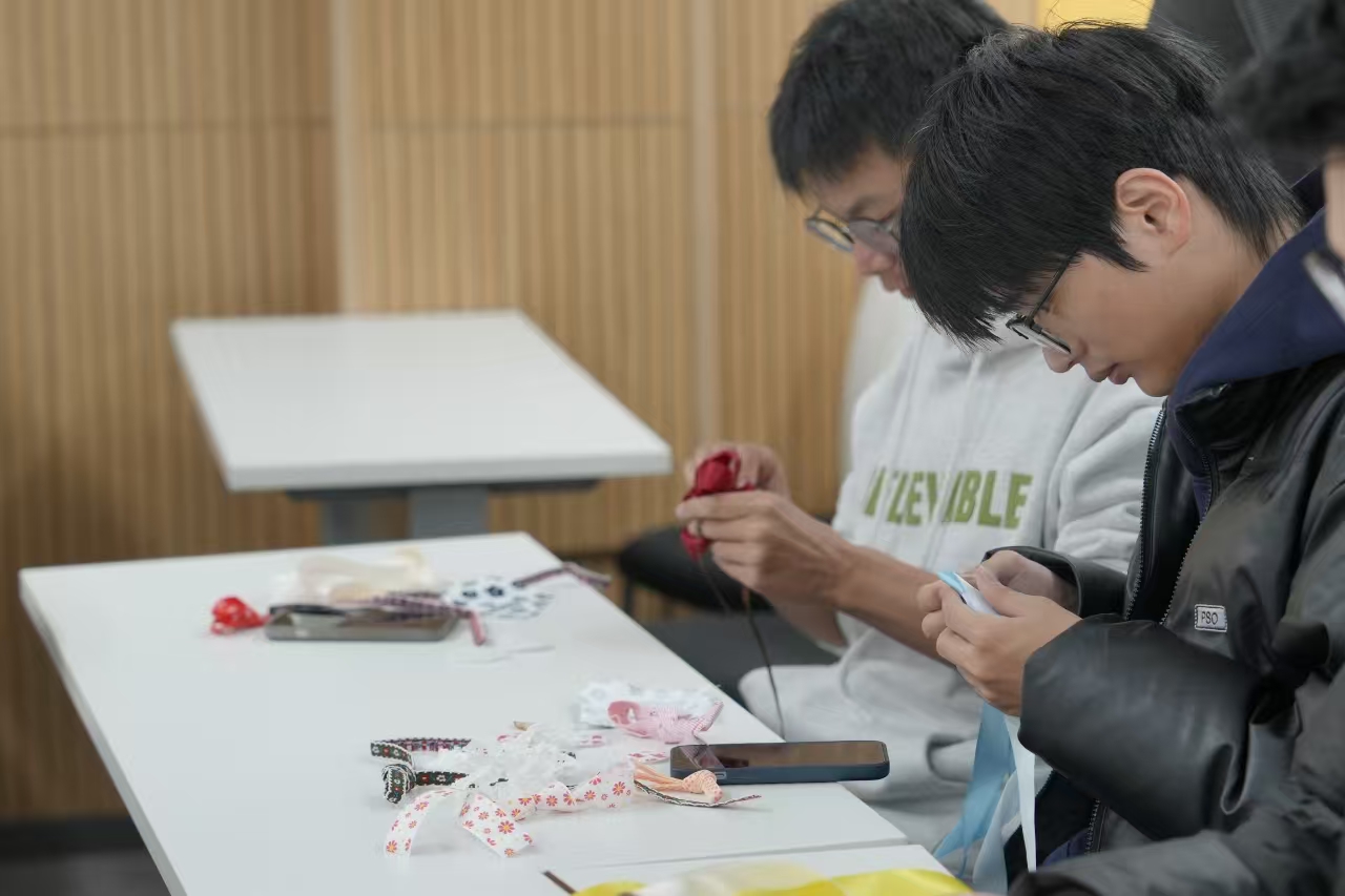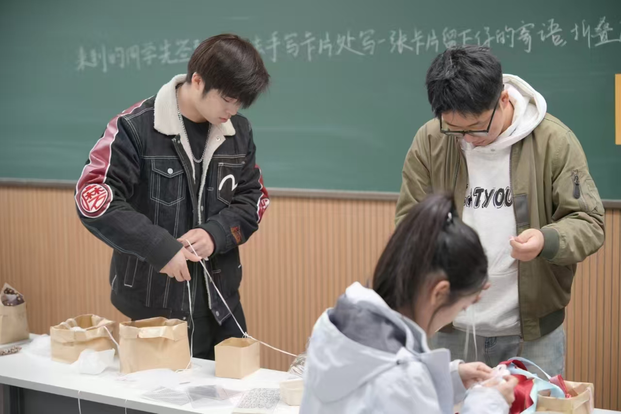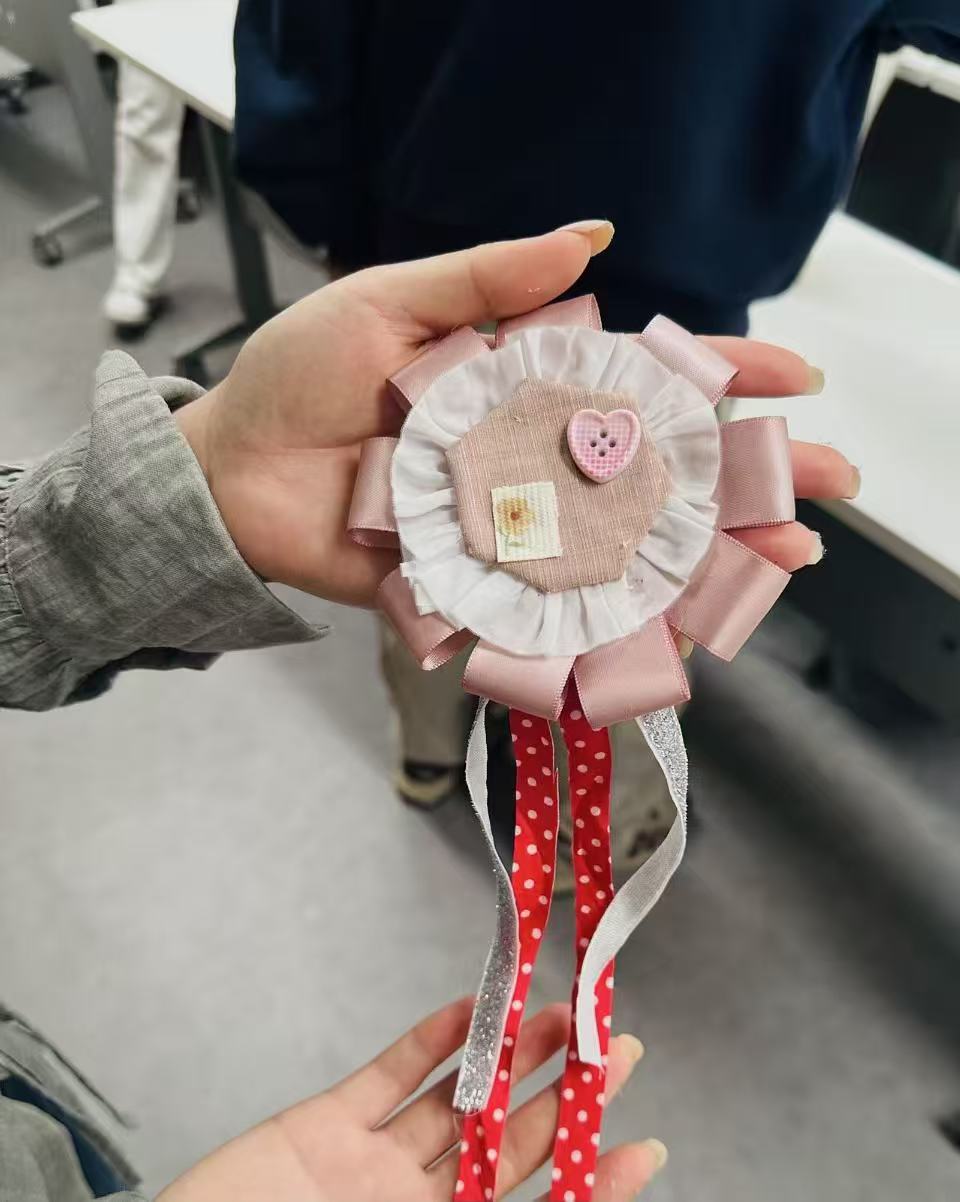 活动伊始,同学们有序签到入场。现场早已备好色彩斑斓的丝带、闪亮的珍珠配饰及剪刀、胶水等工具,琳琅满目排布整齐。同学们挑选材料后,纷纷动手实践——裁剪丝带、固定花材、点缀装饰。胸花制作完成后,进入温馨的“盲盒寄语”环节,同学们将提前手写的祝福卡片投入纸箱,再随机抽取一张他人的留言。一句句真挚的话语、一声声温暖的期许,通过小小的卡片传递开来,让每一位参与者在十一月的惬意时光里,既收获了独一无二的手工作品,更珍藏了一份份纯粹的美好与感动。